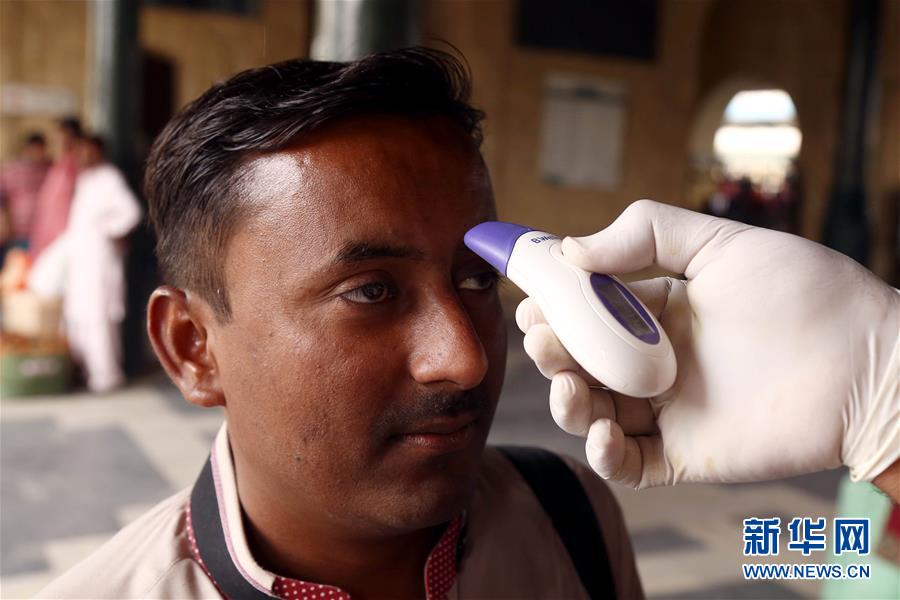 3月15日,在巴基斯坦南部城市卡拉奇,火车站的医务人员为一名旅客测量体温。 巴基斯坦政府部门15日说,该国当天新增19例新冠肺炎确诊病例,累计确诊病例52例,其中2人治愈出院。 新华社发