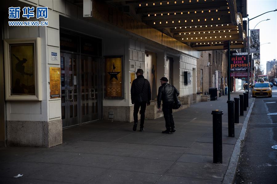 3月15日,在美国纽约,行人向一家暂停营业的百老汇剧院内张望。新华社发(郭克摄)