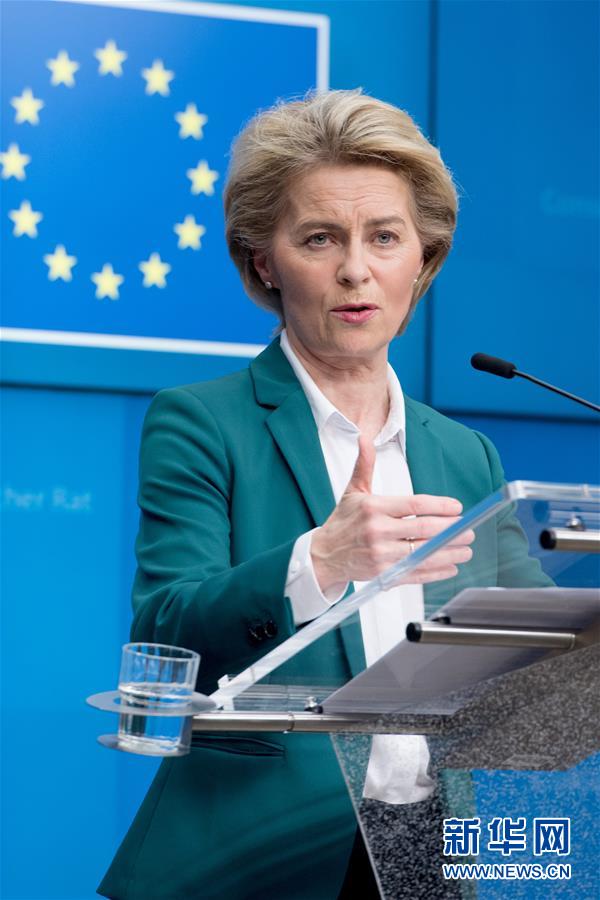 3月16日,在比利时布鲁塞尔的欧盟总部,欧盟委员会主席冯德莱恩出席记者会。 当日,欧盟委员会主席冯德莱恩说,为减缓新冠肺炎疫情传播,提议对欧盟以外人员进入欧盟国家的非必要旅行实施限制。 新华社发
