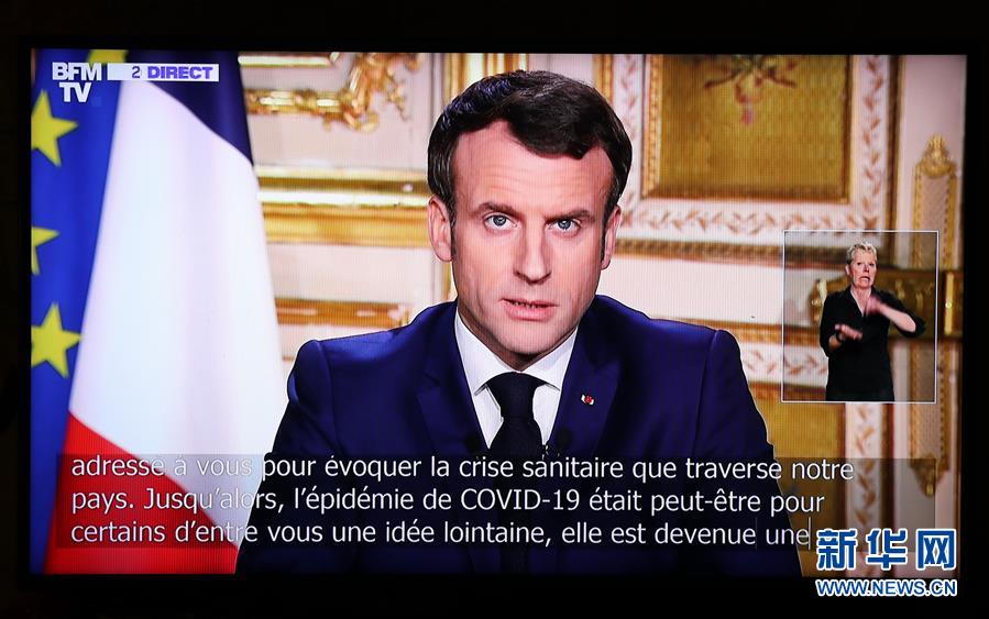这张电视截屏显示的是3月16日,法国总统马克龙在巴黎总统府爱丽舍宫发表电视讲话。 法国总统马克龙16日晚发表电视讲话说,面对新冠肺炎疫情的严峻形势,法国处于“战争状态”,需要全面动员抗击疫情。 新华社发
