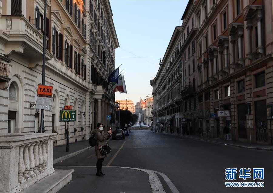 3月16日,在意大利首都罗马,一名女子戴着口罩出行。 新华社记者 程婷婷 摄