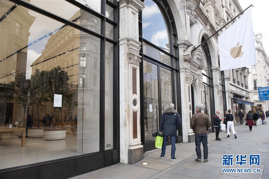 3月16日,在英国伦敦,人们阅读一家苹果零售店门口贴出的暂停营业告示。 随着英国新冠肺炎疫情发展,英国政府呼吁人们尽量避免不必要的社交接触和不必要的出行。 新华社发(雷伊·唐摄)