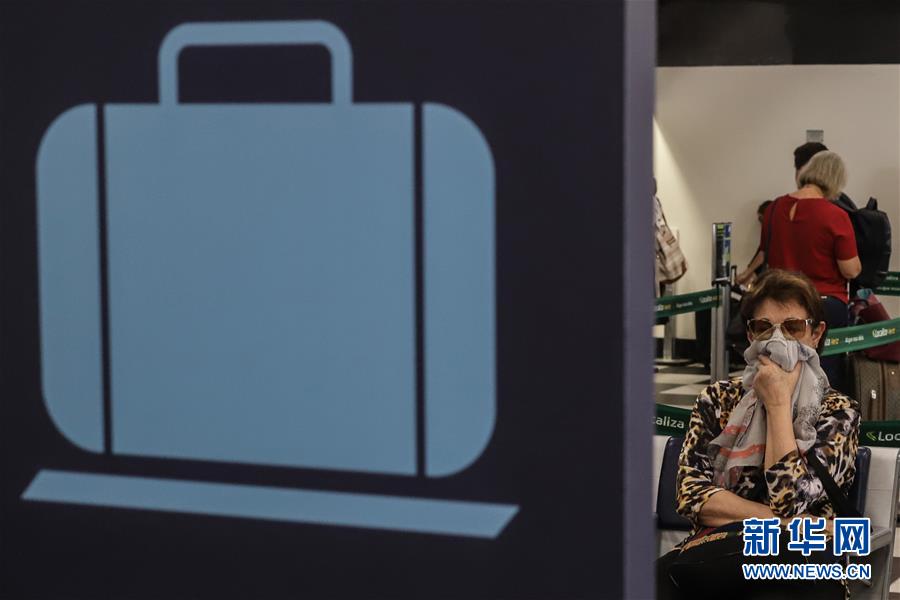3月16日,一名女子在巴西圣保罗孔戈尼亚斯机场用围巾遮蔽口鼻充当口罩。 面对巴西新冠肺炎疫情严峻的形势,很多圣保罗民众逐渐加强了防疫举措,在出入机场等人员密集、流动性大的场所时戴上了口罩。 新华社发(拉赫尔·帕特拉索 摄)