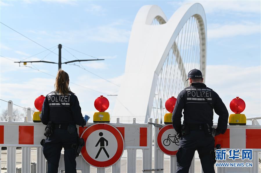 3月17日,警察在位于德国小城凯尔的德法边境“两岸桥”附近执勤。 德国疾控机构罗伯特·科赫研究所公布的最新数据显示,截至16日15时,德国累计确诊病例升至6012例,死亡13例。德国政府从16日起加强对奥地利、瑞士、法国、卢森堡和丹麦五国的边境管控。如无合理原因,将不再允许旅行进出。但货运交通和跨境工作通勤不受边控影响。 新华社发(乌尔里希·胡夫纳格尔 摄)