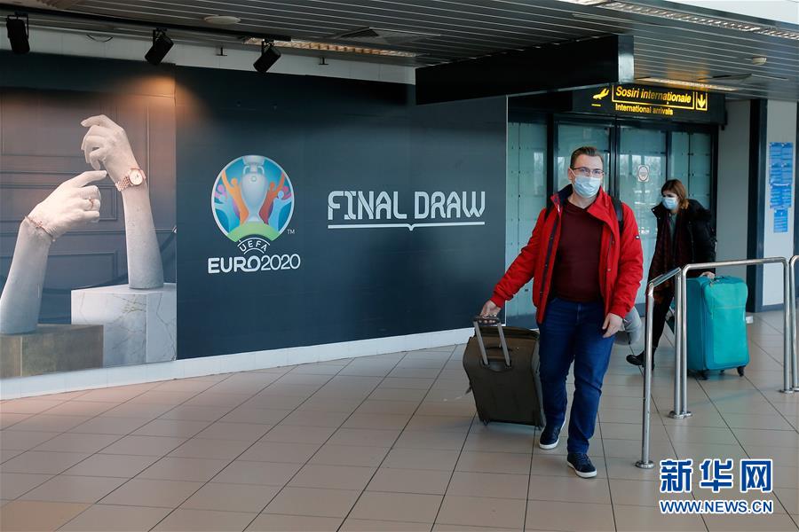 3月17日,在罗马尼亚首都布加勒斯特国际机场,戴着口罩的旅客从2020欧洲杯的宣传海报前走过。新华社发 (克里斯泰尔摄)