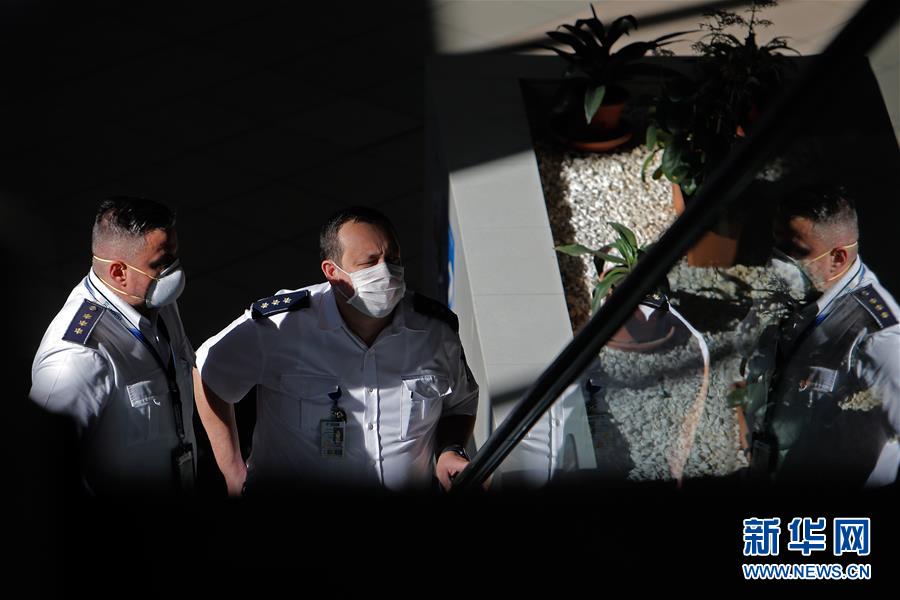 3月17日,在罗马尼亚首都布加勒斯特国际机场,航空公司的工作人员戴着口罩。新华社发 (克里斯泰尔摄)