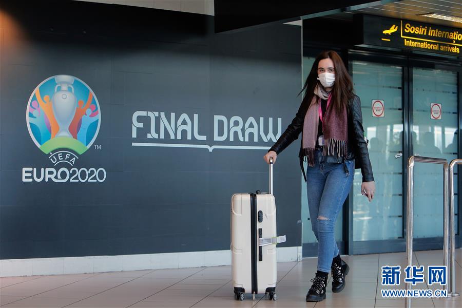 3月17日,在罗马尼亚首都布加勒斯特国际机场,一名戴着口罩的旅客从2020欧洲杯的海报前走过。新华社发 (克里斯泰尔摄)