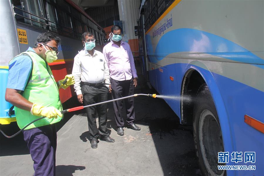 3月18日,在印度班加罗尔,工作人员为公交车消毒。 印度卫生部18日发布的最新数据显示,截至当天17时,该国新增14例新冠肺炎确诊病例,累计确诊病例数达151例。其中,治愈出院14例,另有3例死亡。 新华社发