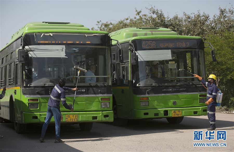 3月18日,在印度首都新德里,工作人员为公交车消毒。 印度卫生部18日发布的最新数据显示,截至当天17时,该国新增14例新冠肺炎确诊病例,累计确诊病例数达151例。其中,治愈出院14例,另有3例死亡。 新华社发(贾韦德·达尔摄)