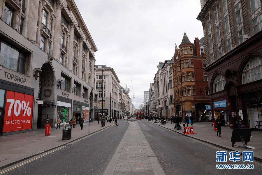 3月18日,在英国伦敦,往日喧嚣的牛津街店铺关闭,行人减少。 截至3月18日,英国累计新冠肺炎确诊病例2626例,死亡病例过百。 新华社发(蒂姆·爱尔兰摄)