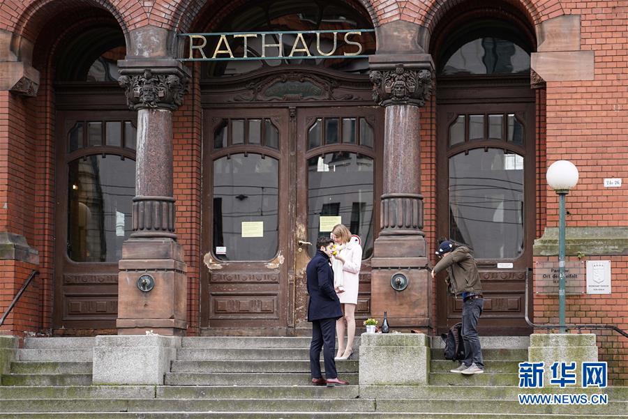 3月20日,一对刚刚登记结婚的新人在德国首都柏林潘科区的市政厅前庆祝。 德国疾控机构罗伯特·科赫研究所所长威勒20日宣布,德国新冠肺炎确诊病例一日增长2985例,累计13957例。 新华社记者 任珂 摄