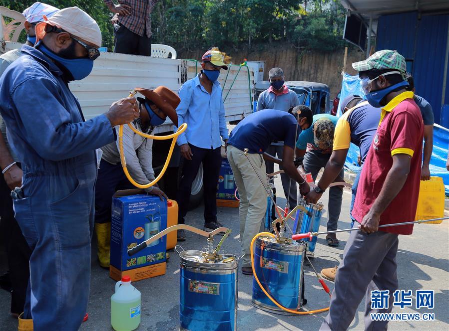 3月23日,在斯里兰卡科特,工作人员准备为公共场所消毒。 为遏制新冠疫情发展,斯里兰卡从20日开始实行宵禁。 新华社发(阿吉特·佩雷拉摄)
