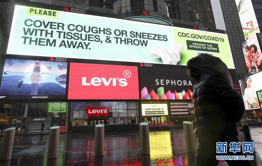 3月23日,在美国纽约时报广场,大屏幕上播放防控新冠肺炎的知识。 美国纽约州州长安德鲁·科莫3月20日签署针对该州1900多万居民的行政令,规定全州所有非关键行业企业的工作人员居家办公以缓解新冠肺炎疫情。该行政令将于当地时间22日晚间生效。 新华社记者 王迎 摄
