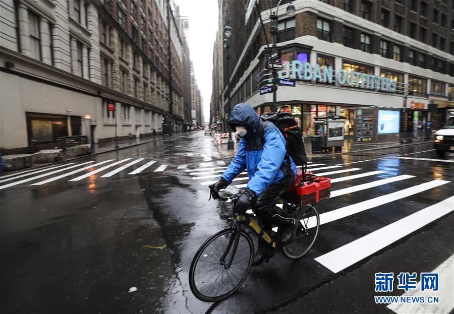 3月23日,一名外卖送货员戴口罩骑行在美国纽约街头。 美国纽约州州长安德鲁·科莫3月20日签署针对该州1900多万居民的行政令,规定全州所有非关键行业企业的工作人员居家办公以缓解新冠肺炎疫情。该行政令将于当地时间22日晚间生效。 新华社记者 王迎 摄