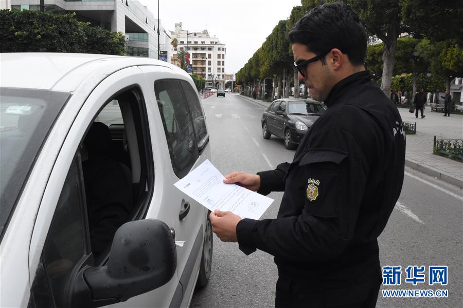 3月24日,在突尼斯首都突尼斯市,警察检查过往车辆。 新华社发 (阿代尔摄)