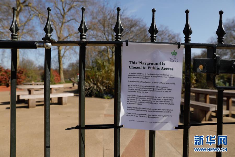 新华社照片,伦敦,2020年3月24日 (国际疫情)(8)英国政府禁止民众不必要外出 3月24日,在英国伦敦,海德公园内的游乐场贴出关闭的告示。 英国首相约翰逊23日下午取消了每日例行的疫情通报会,改为晚间发布电视讲话。他在电视讲话中说,从当晚开始英国民众必须停止一切不必要的外出。他明确表示,能允许的外出仅限于以下四种情况:购买生活必需品、寻求医疗帮助、仅限一种户外锻炼方式、“绝对必要”的上下班。 新华社发(蒂姆·爱尔兰摄)