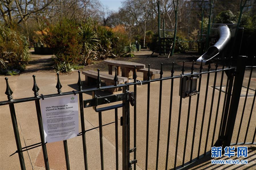 3月24日,在英国伦敦,海德公园内的游乐场贴出关闭的告示。 英国首相约翰逊23日下午取消了每日例行的疫情通报会,改为晚间发布电视讲话。他在电视讲话中说,从当晚开始英国民众必须停止一切不必要的外出。他明确表示,能允许的外出仅限于以下四种情况:购买生活必需品、寻求医疗帮助、仅限一种户外锻炼方式、“绝对必要”的上下班。 新华社发(蒂姆·爱尔兰摄)