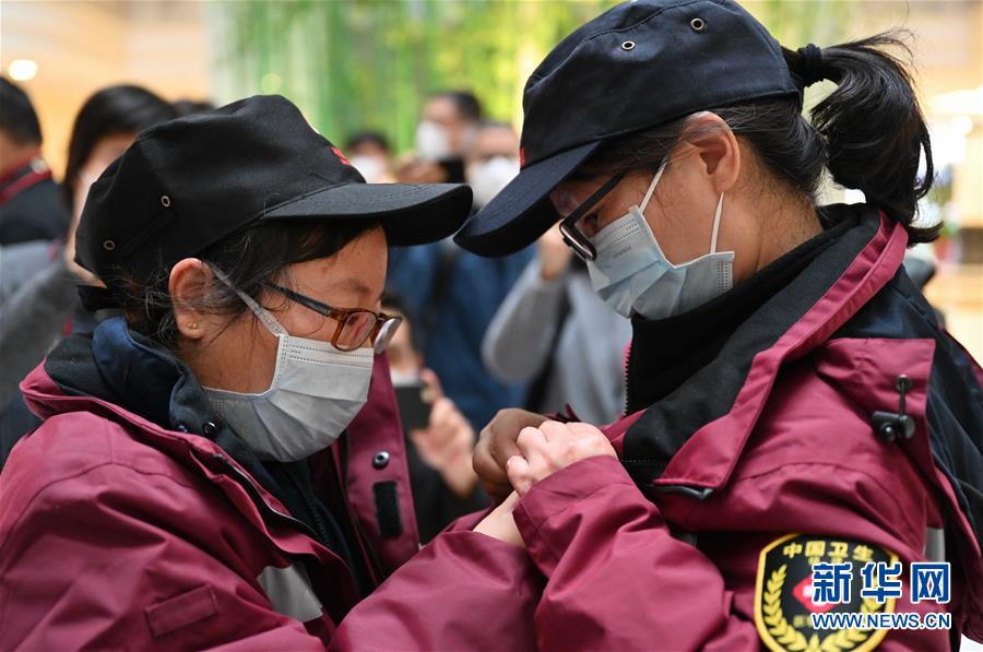 3月25日,中国第三批赴意大利抗疫医疗专家组成员在相互整理服装。新华社记者 魏培全 摄