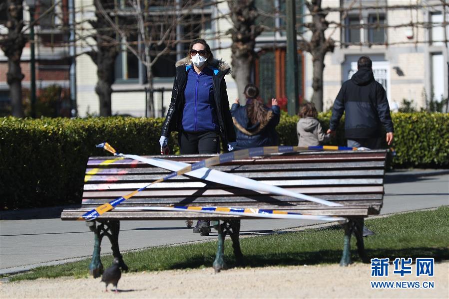 3月25日,在比利时布鲁塞尔的一个街心公园内,行人经过被拉上警戒线的长椅。 新华社记者 郑焕松 摄