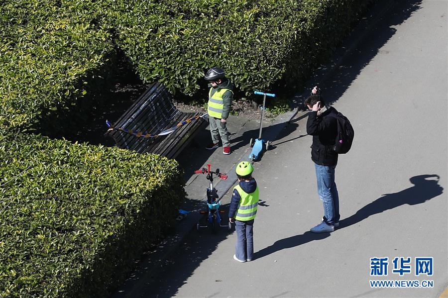 3月25日,在比利时布鲁塞尔的一个街心公园内,人们站在被拉上警戒线的长椅旁。 新华社记者 郑焕松 摄