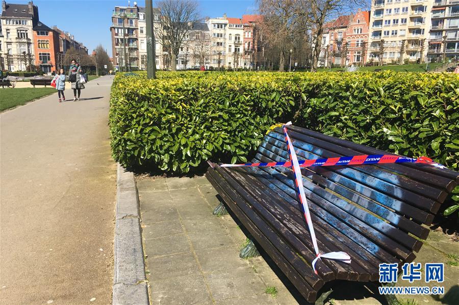 3月25日,在比利时布鲁塞尔的一个街心公园内,一条长椅被拉上警戒线,禁止人们久坐聚集。 新华社记者 郑焕松 摄