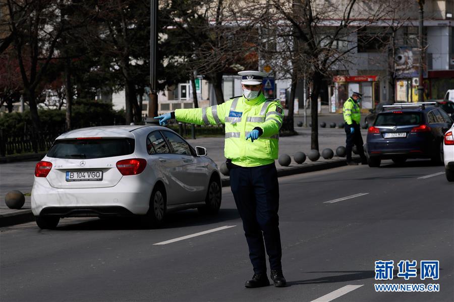 3月25日,在罗马尼亚首都布加勒斯特,一名警察在街上指挥交通。 新华社发(克里斯泰尔 摄)