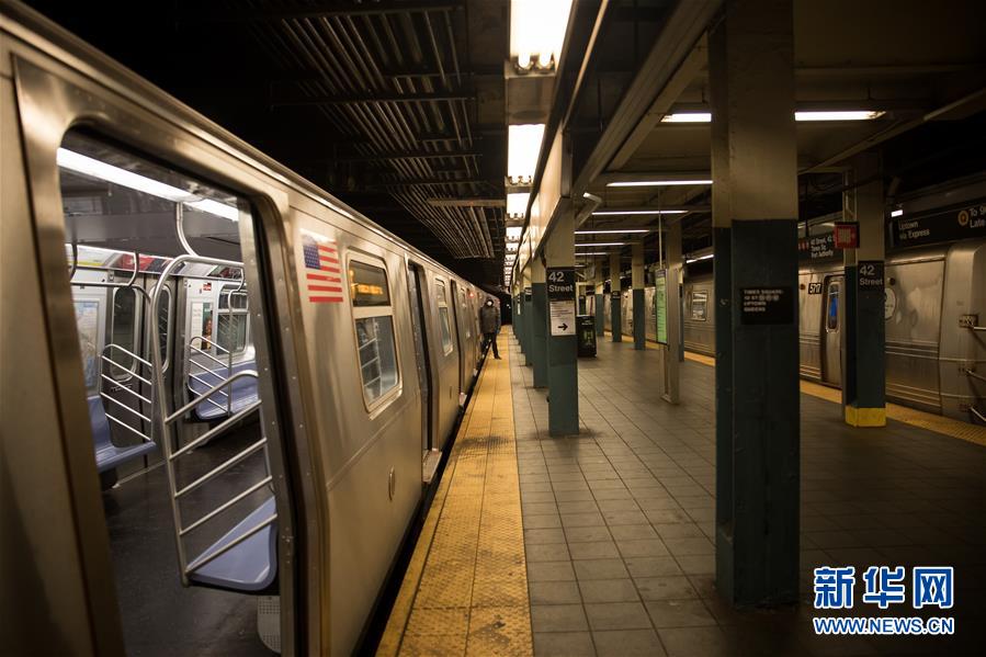 3月26日,在美国纽约曼哈顿时报广场地铁站,一名乘客走出空荡荡的车厢。新华社发(郭克摄)