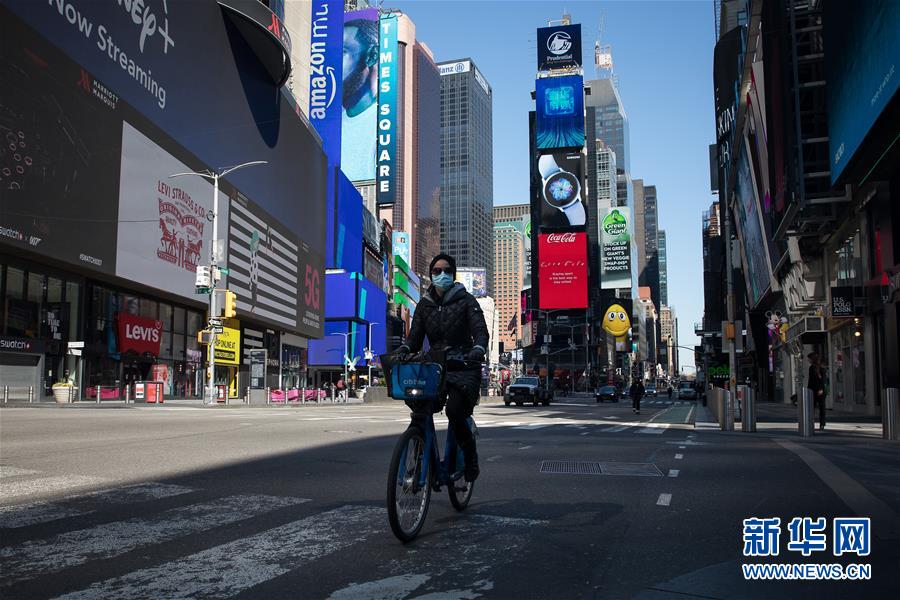 3月26日,在美国纽约,一名戴口罩的骑车人经过曼哈顿时报广场。新华社发(郭克摄)