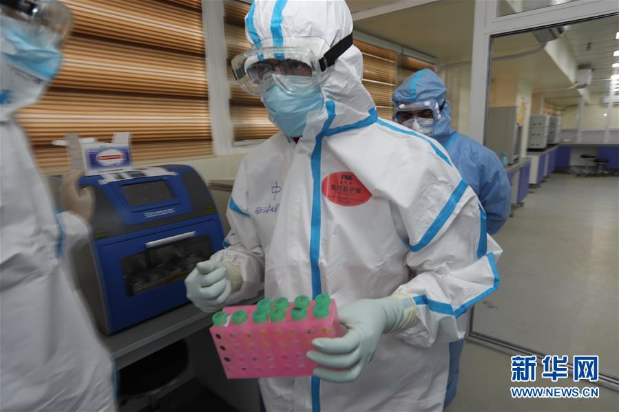 3月26日,在伊拉克巴格达,专家组成员、中山大学达安基因股份有限公司技术总监杨鸿辉(中)在中国援建伊拉克的核酸检测实验室工作。 新华社发