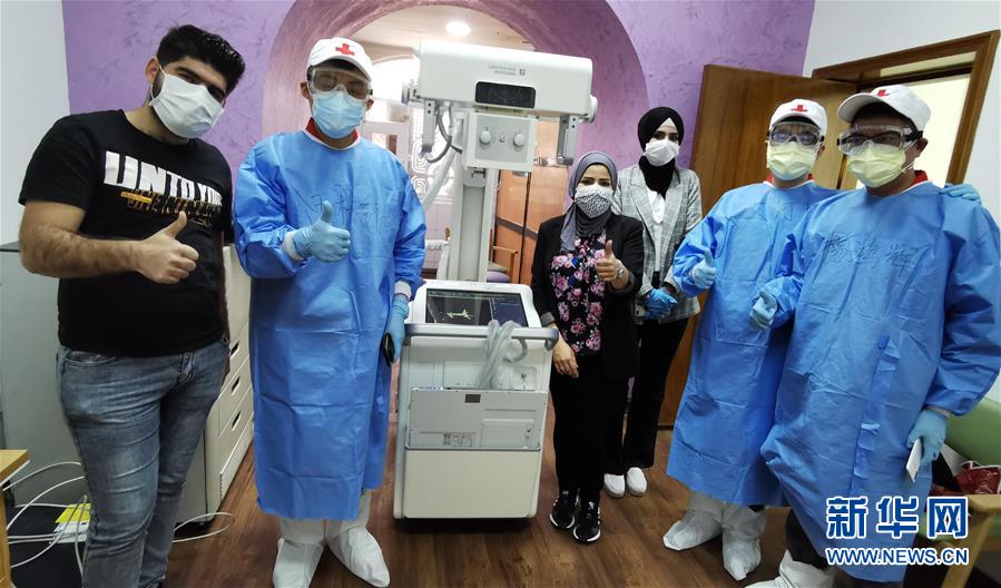 在伊拉克巴格达,专家组成员:上海联影医疗科技有限公司的临床应用培训专家王桉铭(左二)、中山大学达安基因股份有限公司技术总监杨鸿辉(右一)、艾河旭(右二)在成功安装移动X光机后与当地医务人员合影。(手机拍摄) 新华社发