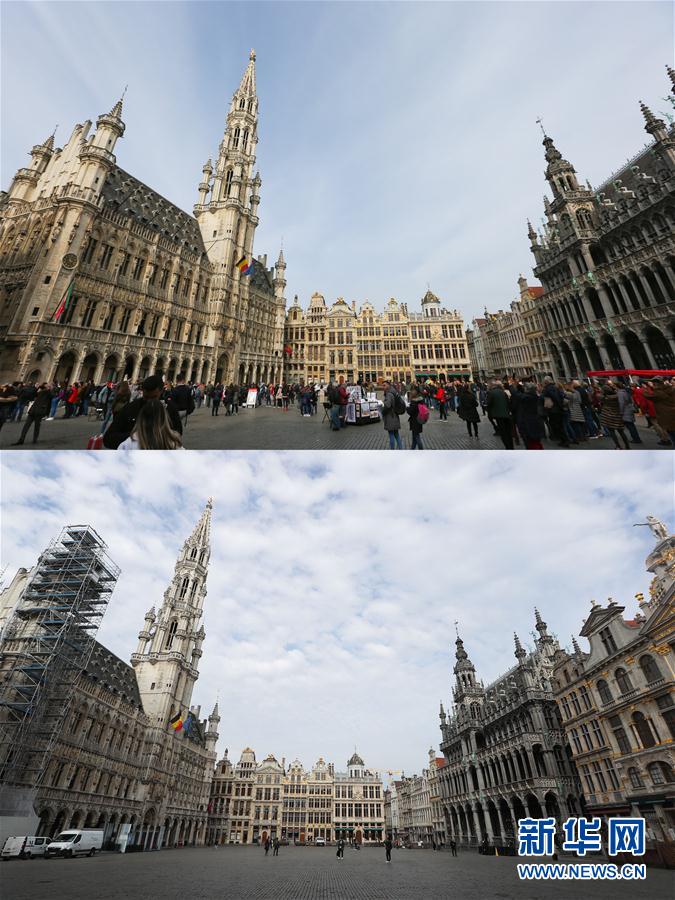 3月以来,新冠肺炎疫情在全球迅速蔓延,感染人数呈几何级增长,给全球公共卫生安全带来巨大挑战。人类是一个休戚与共的命运共同体,国际社会应该守望相助、同舟共济。 拼版照片显示:(上)2019年4月6日,游客在比利时布鲁塞尔最主要的商业场所、被列为世界文化遗产的大广场参观。(下)2020年3月16日,比利时布鲁塞尔的大广场上游客稀少。 新华社记者 郑焕松 摄