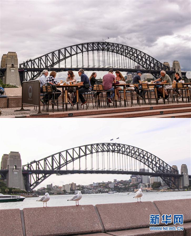 3月以来,新冠肺炎疫情在全球迅速蔓延,感染人数呈几何级增长,给全球公共卫生安全带来巨大挑战。人类是一个休戚与共的命运共同体,国际社会应该守望相助、同舟共济。 拼版照片显示:(上)2020年3月10日,人们在澳大利亚悉尼海港大桥附近用餐。(下)2020年3月24日,澳大利亚悉尼海港大桥附近空无一人。 新华社记者 白雪飞 摄