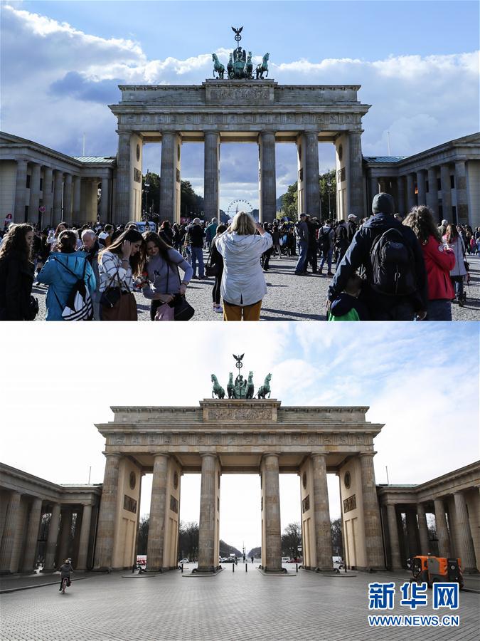 3月以来,新冠肺炎疫情在全球迅速蔓延,感染人数呈几何级增长,给全球公共卫生安全带来巨大挑战。人类是一个休戚与共的命运共同体,国际社会应该守望相助、同舟共济。 拼版照片显示:分别于2016年10月3日(上)和2020年3月19日(下)拍摄的德国柏林勃兰登堡门。 新华社记者 单宇琦 摄
