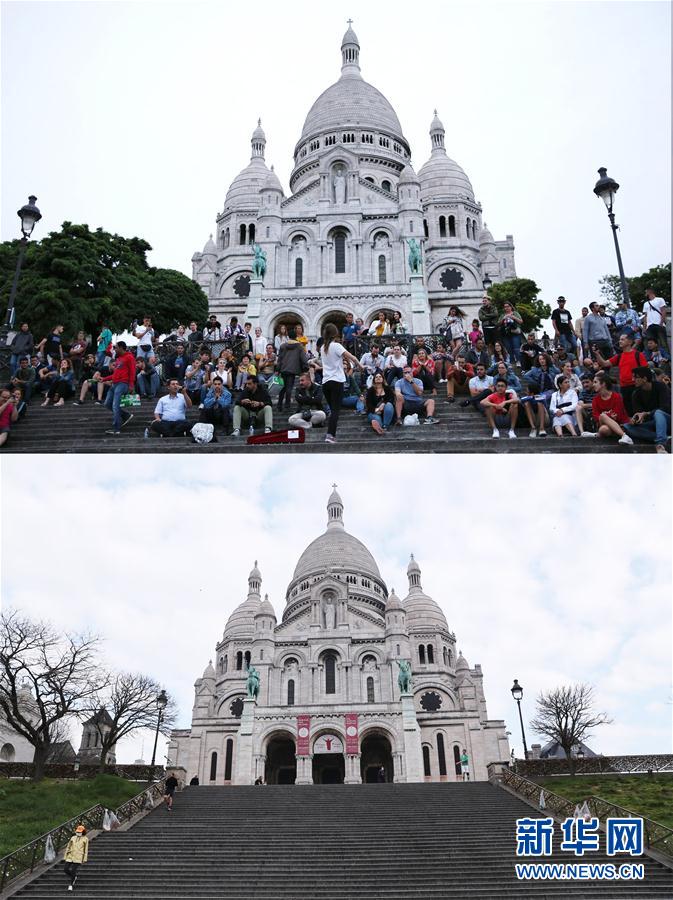 3月以来,新冠肺炎疫情在全球迅速蔓延,感染人数呈几何级增长,给全球公共卫生安全带来巨大挑战。人类是一个休戚与共的命运共同体,国际社会应该守望相助、同舟共济。 拼版照片显示:(上)2019年8月14日,游客聚集在法国巴黎著名景点蒙马特高地的圣心教堂外。(下)2020年3月18日,法国巴黎圣心教堂外行人稀少。 新华社记者 高静 摄