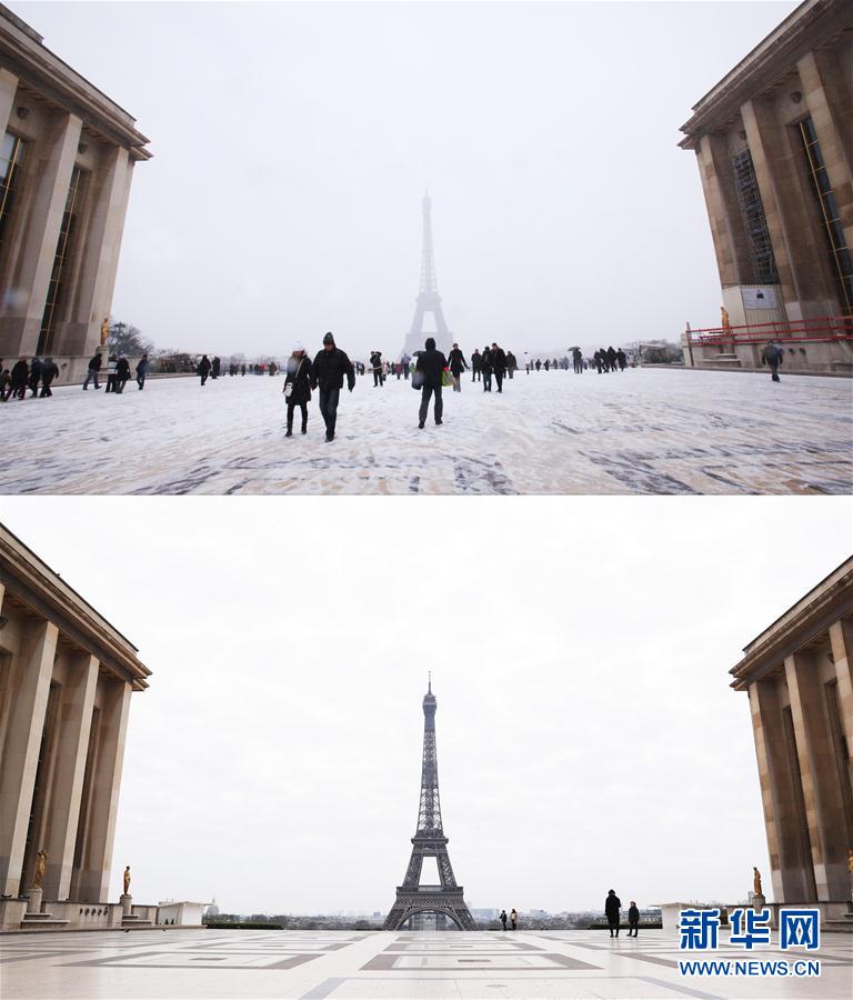 3月以来,新冠肺炎疫情在全球迅速蔓延,感染人数呈几何级增长,给全球公共卫生安全带来巨大挑战。人类是一个休戚与共的命运共同体,国际社会应该守望相助、同舟共济。 拼版照片显示:(上)2010年12月4日,行人在风雪中走过法国巴黎埃菲尔铁塔。(下)2020年3月18日,法国巴黎埃菲尔铁塔前行人稀少。 新华社记者 高静 摄