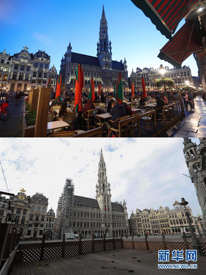 3月以来,新冠肺炎疫情在全球迅速蔓延,感染人数呈几何级增长,给全球公共卫生安全带来巨大挑战。人类是一个休戚与共的命运共同体,国际社会应该守望相助、同舟共济。 拼版照片显示:(上)2019年8月19日,人们在比利时布鲁塞尔大广场上的一家餐馆用餐。(下)2020年3月16日,比利时布鲁塞尔大广场上游客稀少,周围饭馆、酒吧已经停业。 新华社记者 郑焕松 摄