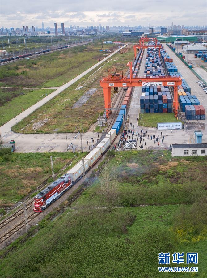 3月28日,开往德国杜伊斯堡的中欧(武汉)班列从中铁联集武汉中心站驶出(无人机照片)。 3月28日上午10点,中欧班列(武汉)X8015/6次运载50只集装箱从中铁联集武汉中心站始发。班列将从阿拉山口出境,预计15天后抵达德国杜伊斯堡。这是自疫情防控以来,从武汉开出的首趟中欧班列,标志着中欧班列(武汉)恢复常态化运营。 新华社记者肖艺九摄