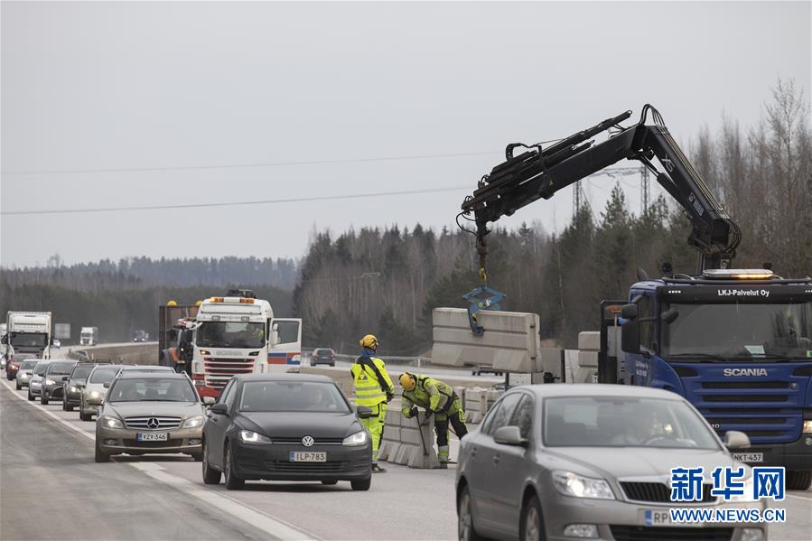 3月27日,道路工人在位于芬兰乌西玛大区北缘的许温凯市的公路上设立检查站,为封锁行动做准备。 芬兰政府日前宣布将封锁该国疫情最严重的包含首都赫尔辛基在内的乌西玛大区,以遏制新冠肺炎疫情向全国扩散的势头。 新华社发(马蒂·马蒂凯宁摄)