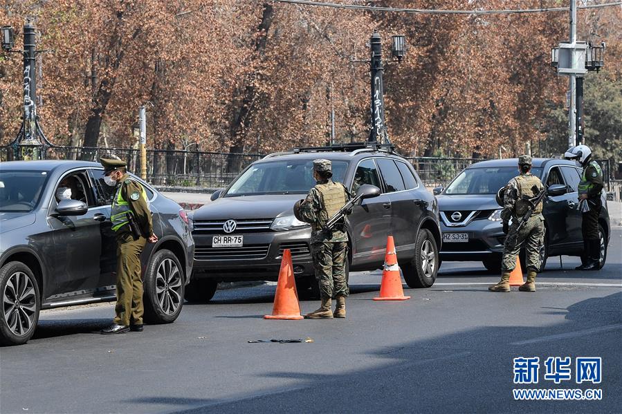 3月27日,在智利首都圣地亚哥,军人和警察在街头查验司机出行许可。新华社发(豪尔赫·比列加斯摄)