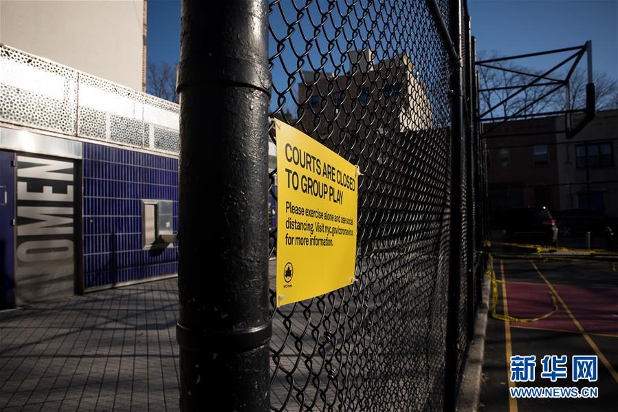 这是3月27日在美国纽约一个篮球场拍摄的通知篮球场因疫情关闭的牌子。