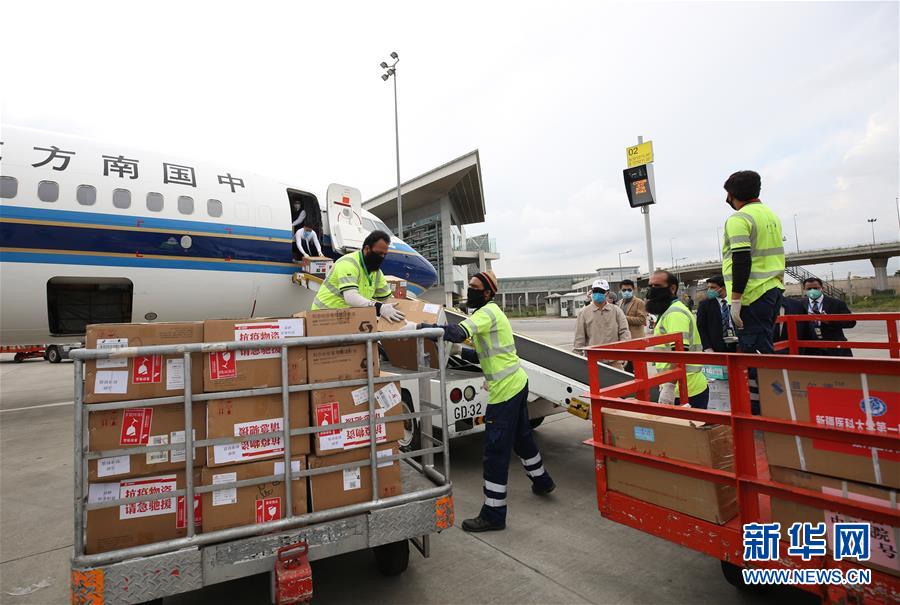 3月28日,在巴基斯坦伊斯兰堡国际机场,工作人员卸载中国捐赠的医疗救治物资。 新华社记者 刘天 摄