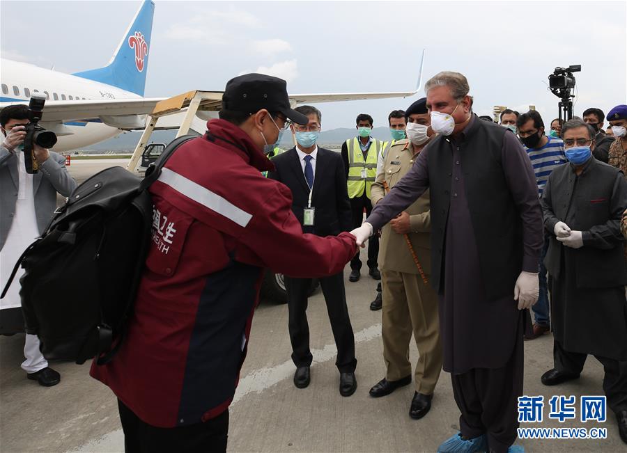 3月28日,在巴基斯坦伊斯兰堡国际机场,巴基斯坦外长库雷希(前右)与中国政府赴巴基斯坦抗疫医疗专家组成员握手。 新华社记者 刘天 摄