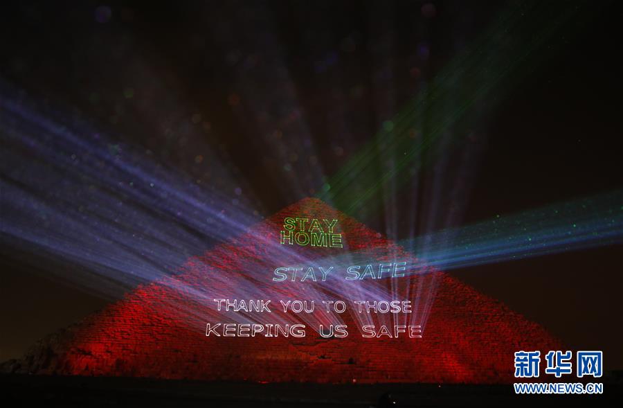 3月30日,在埃及吉萨,胡夫金字塔上打出标语,为抗击疫情加油。新华社发