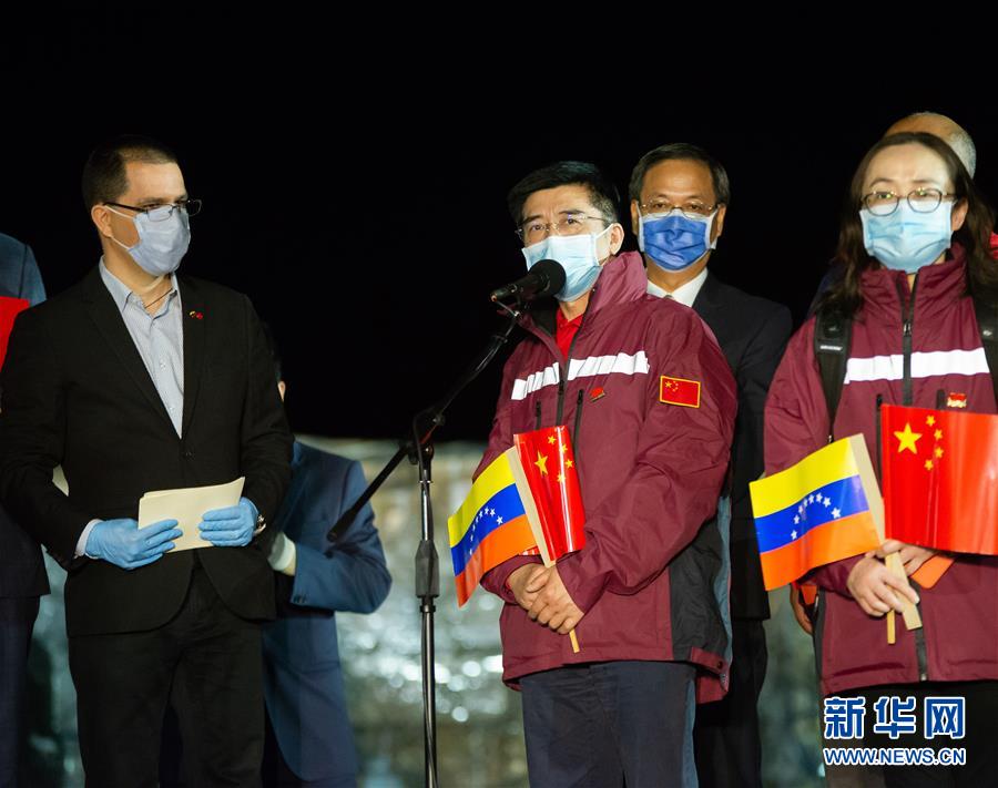 3月30日,在委内瑞拉首都加拉加斯西蒙·玻利瓦尔国际机场,中国抗疫医疗专家组组长黄茂(左二)在欢迎仪式上致辞。 中国向委内瑞拉派遣的抗疫医疗专家组30日抵委。中方捐赠的检测试剂、防护用品、药品等物资也一同抵达。专家组由国家卫生健康委员会组建,来自江苏省,共8人,包括呼吸与危重症医学、传染病控制、实验室检测等多个领域的专家。 新华发(萨尔戈多 摄)