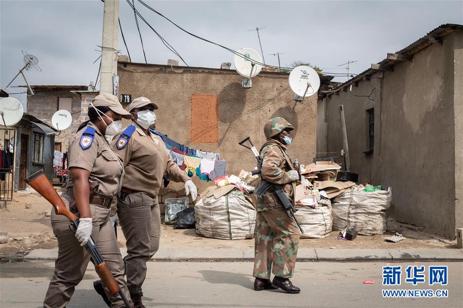 3月31日,在南非约翰内斯堡,警察和士兵在街上巡逻。 受疫情影响,南非已经实施全国范围“封城”。 新华社发(耶希尔 摄)