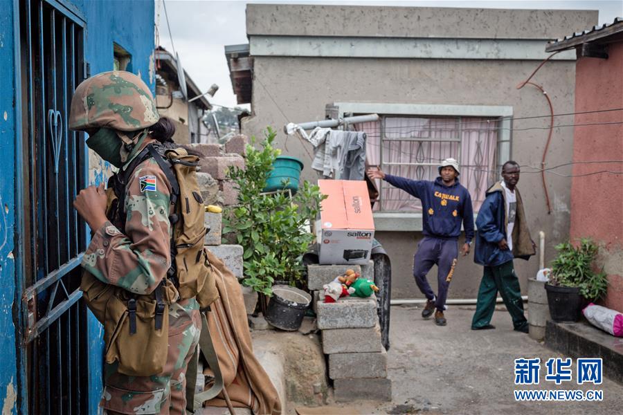 3月31日,在南非约翰内斯堡,士兵在社区内巡逻。 受疫情影响,南非已经实施全国范围“封城”。 新华社发(耶希尔 摄)