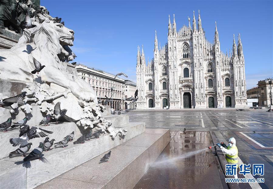 3月31日,在意大利米兰,工作人员清洗米兰大教堂广场。新华社发(达尼埃莱·马斯科洛摄)