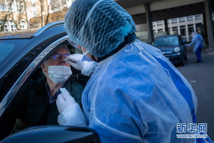 4月1日,在法国巴黎17区,工作人员为一名接受新冠病毒检测的医护人员取样。新华社发(奥雷利安·莫里萨尔摄)