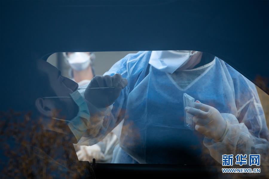 4月1日,在法国巴黎17区,工作人员为一名接受新冠病毒检测的医护人员取样。新华社发(奥雷利安·莫里萨尔摄)