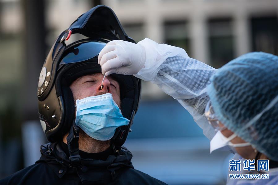 4月1日,在法国巴黎17区,工作人员为一名接受新冠病毒检测的医护人员取样。新华社发(奥雷利安·莫里萨尔摄)